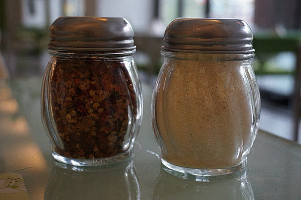 ▼梨子的餐點以健康取向,餐桌上也放著海鹽跟胡椒粒